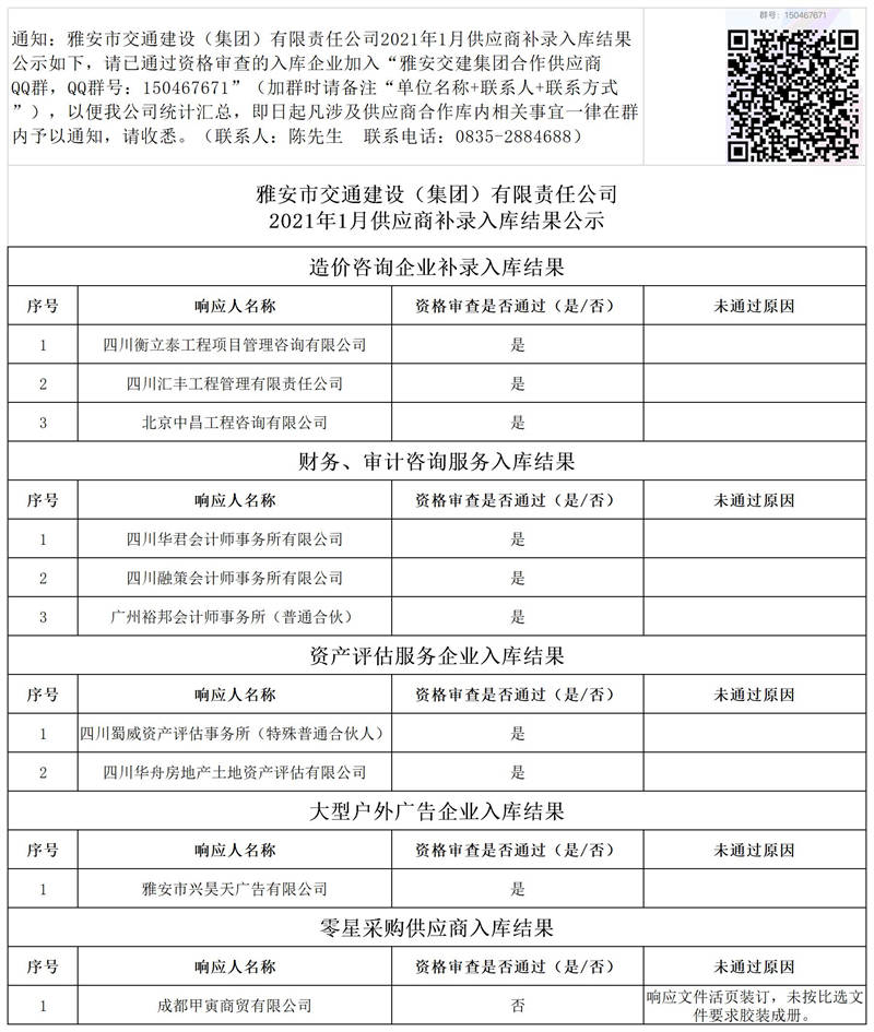 米兰体育-米兰(中国)官网 2021年1月供应商补录入库结果公示