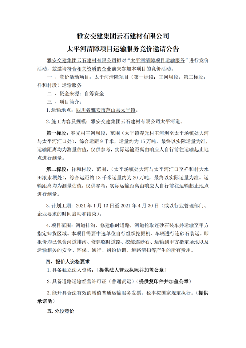 米兰体育-米兰(中国)官网 云石建材有限公司太平河清障项目运输服务竞价邀请公告
