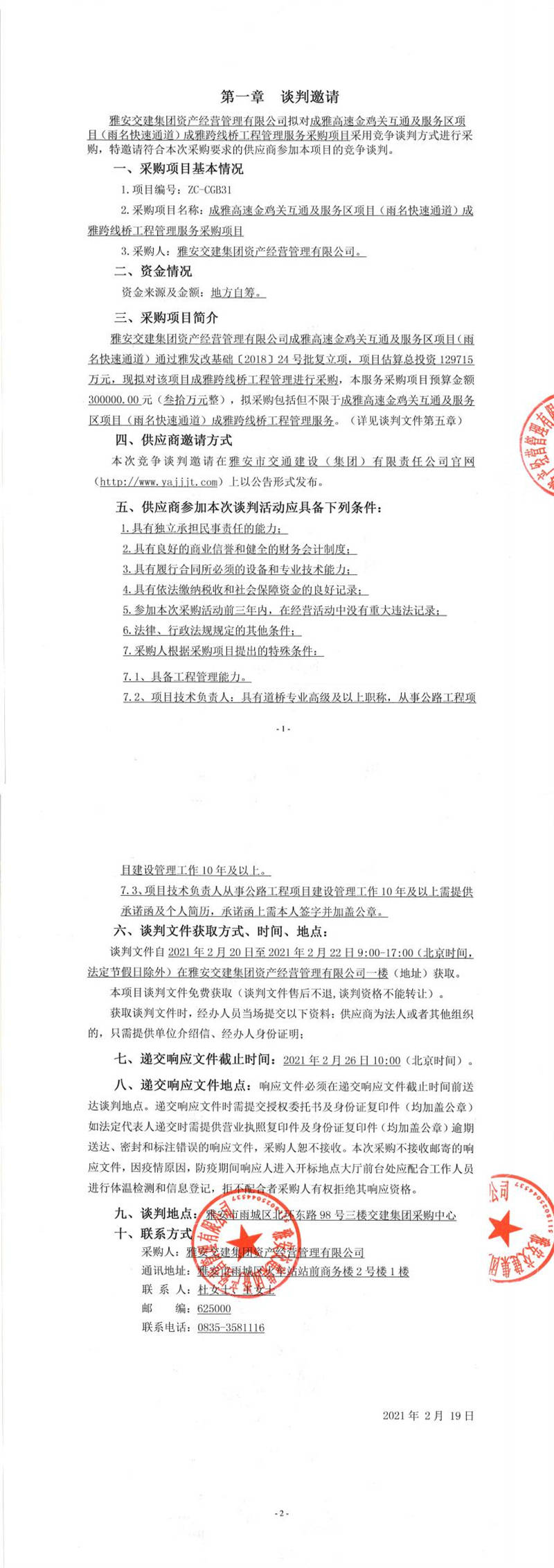米兰体育-米兰(中国)官网 资产经营管理有限公司成雅高速金鸡关互通及服务区项目(雨名快速通道)成雅跨线桥工程管理服务采购项目竞争谈判公告