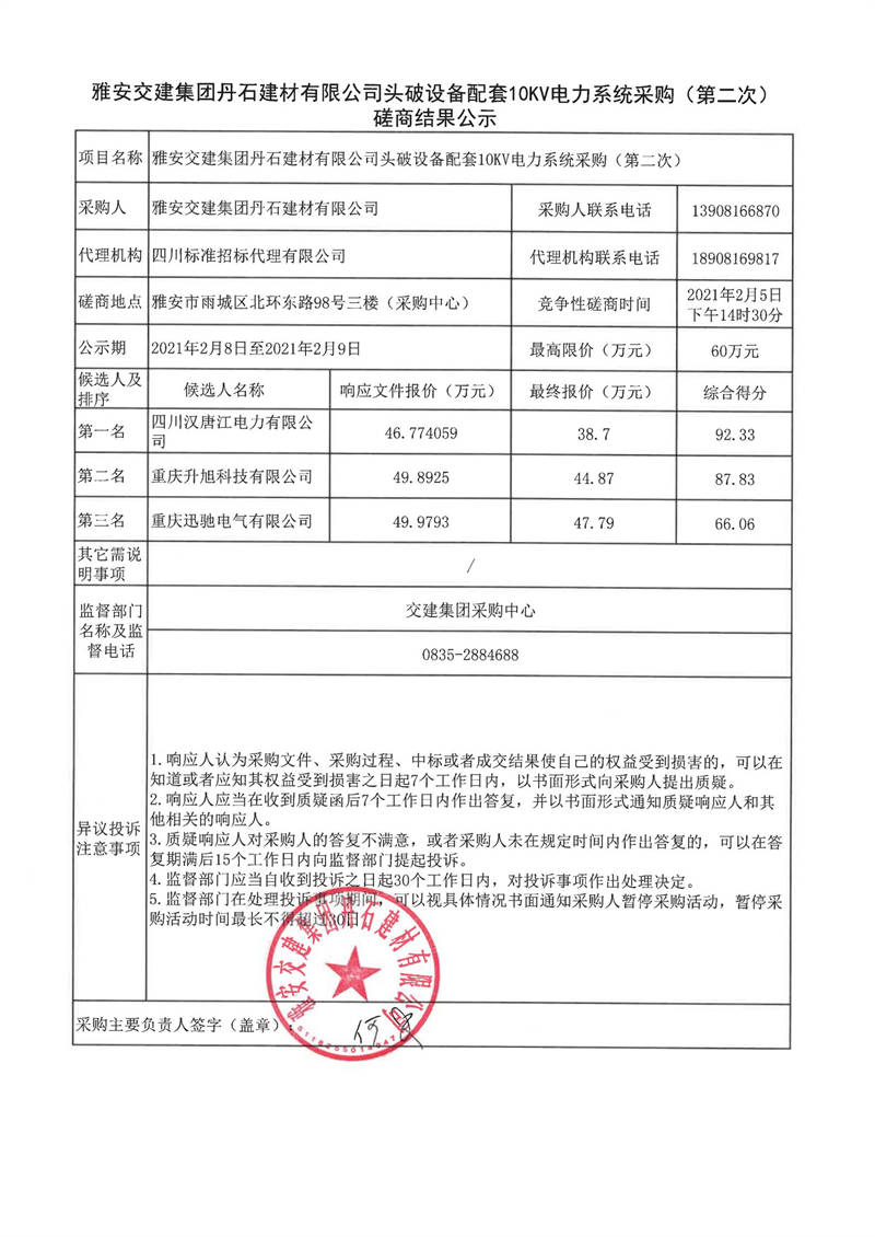 米兰体育-米兰(中国)官网 丹石建材有限公司头破设备配套10KV电力系统采购(第二次)磋商结果公示