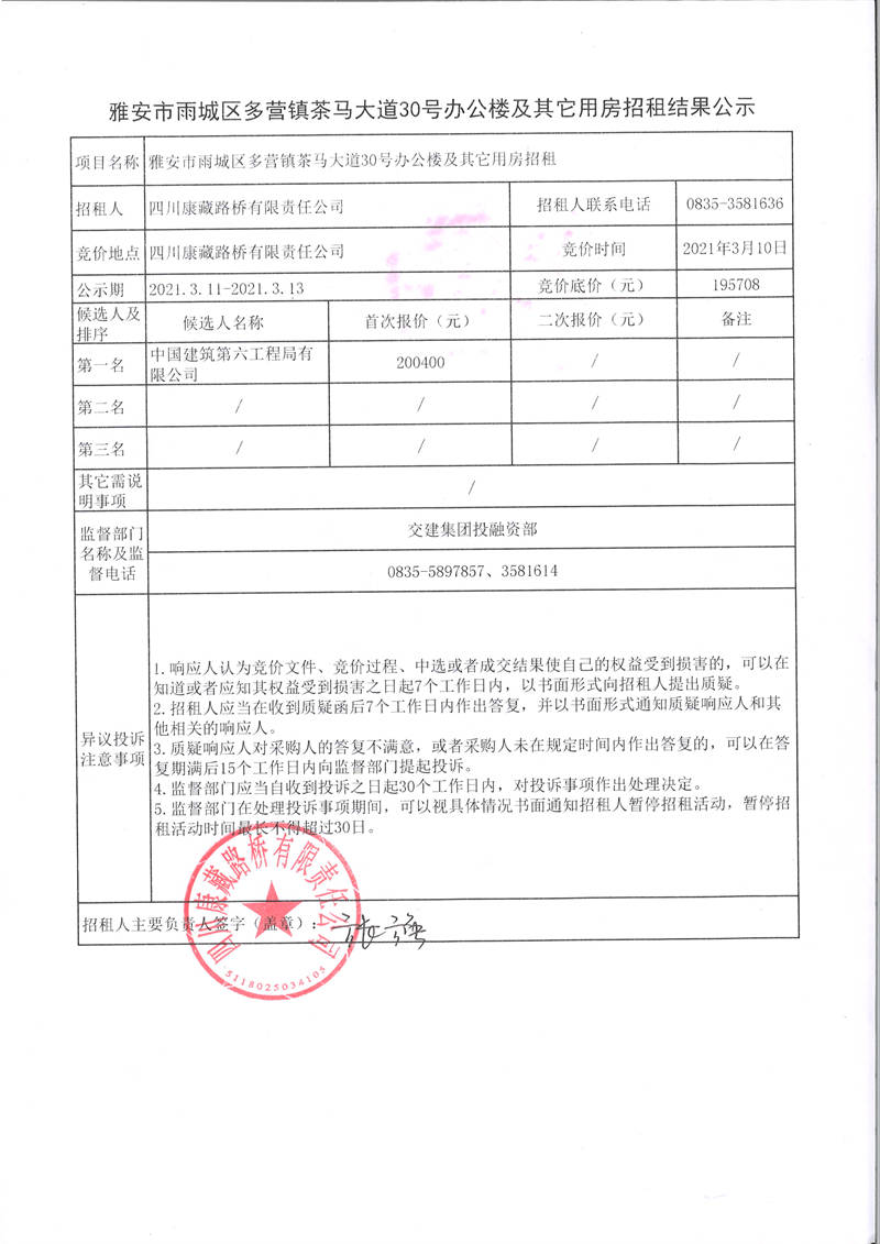 四川康藏路桥有限责任公司雅安市雨城区多营镇茶马大道30号办公楼及其它用房招租结果公示