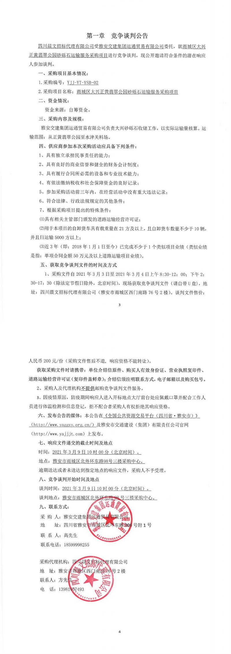 米兰体育-米兰(中国)官网 运通贸易有限公司雨城区大兴正黄翡翠公园砂砾石运输服务采购项目竞争谈判公告