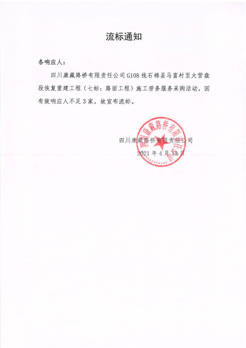 四川康藏路桥有限责任公司G108线石棉县马富村至大营盘段恢复重建工程(七标:路面工程)施工劳务服务流标通知