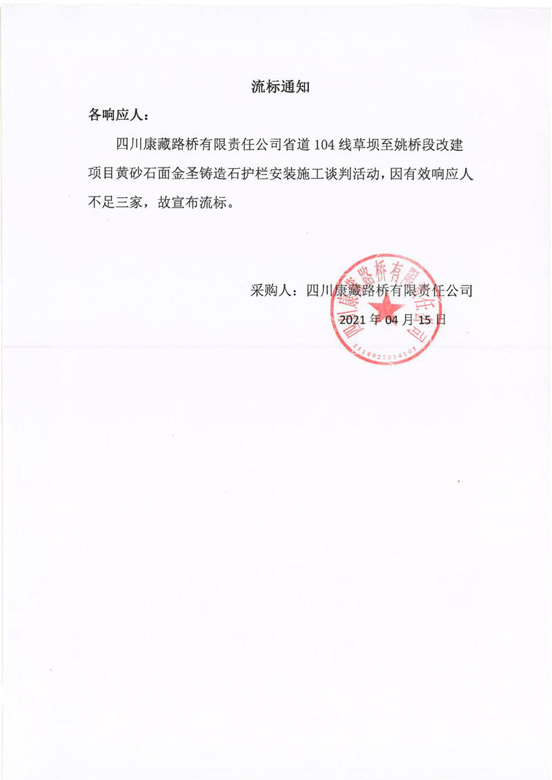 四川康藏路桥有限责任公司省道104线草坝至姚桥段改建项目黄砂石面金圣铸造石护栏安装施工流标通知