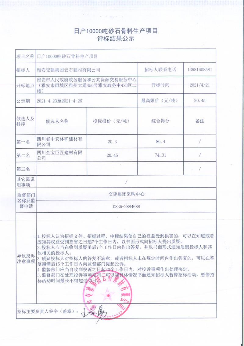米兰体育-米兰(中国)官网 云石建材有限公司日产10000吨砂石骨料生产项目评标结果公示