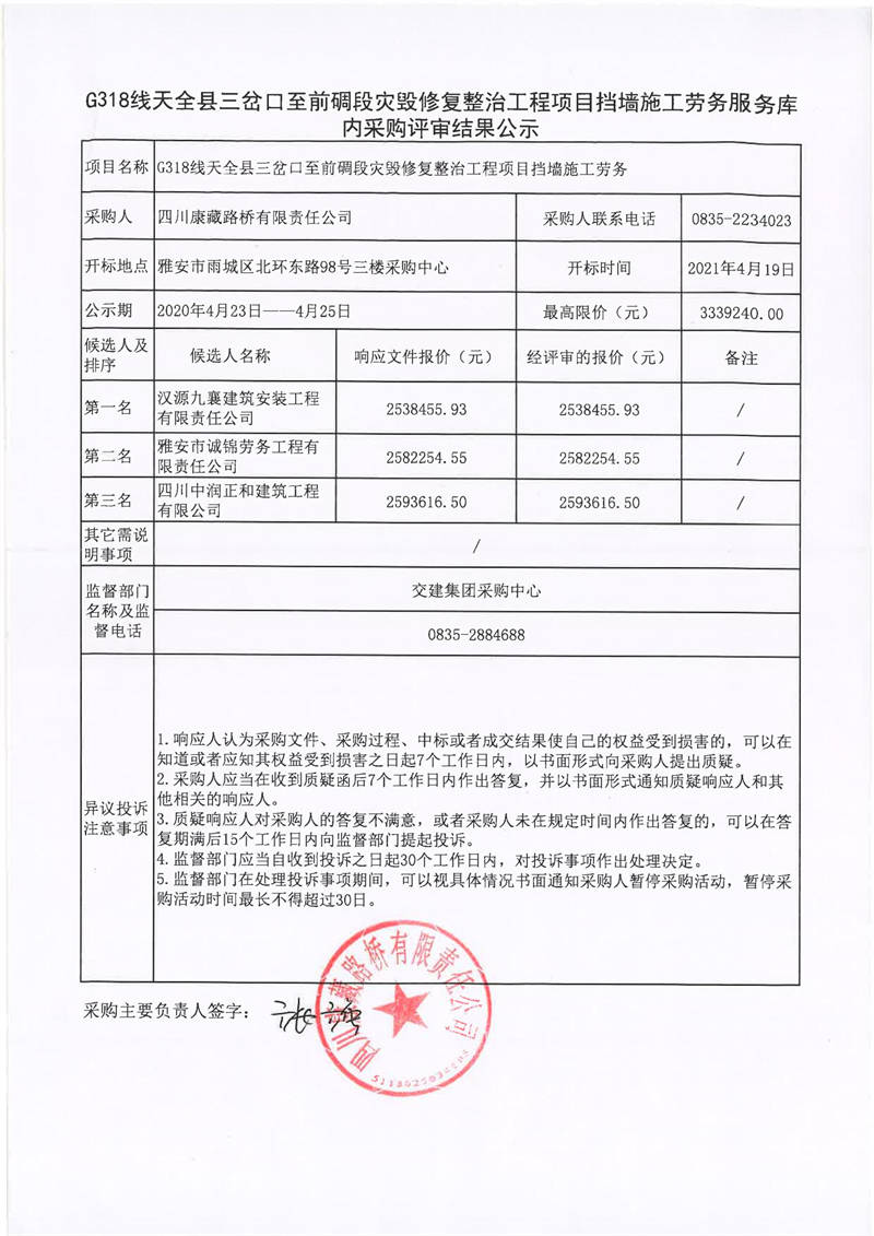 四川康藏路桥有限责任公司G318线天全县三岔口至前碉段灾毁修复整治工程项目挡墙施工劳务服务库内采购评审结果公示
