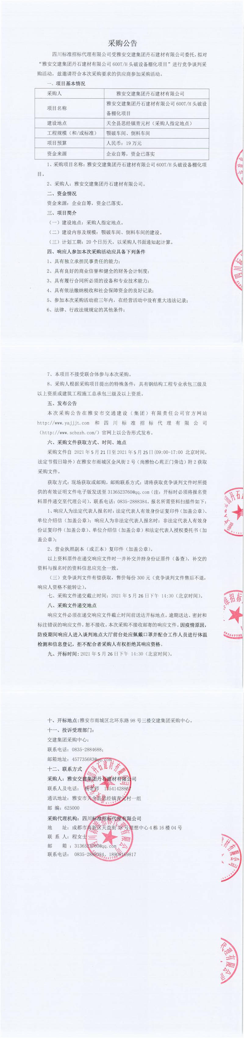 米兰体育-米兰(中国)官网 丹石建材有限公司600T/H头破设备棚化项目竞争谈判公告