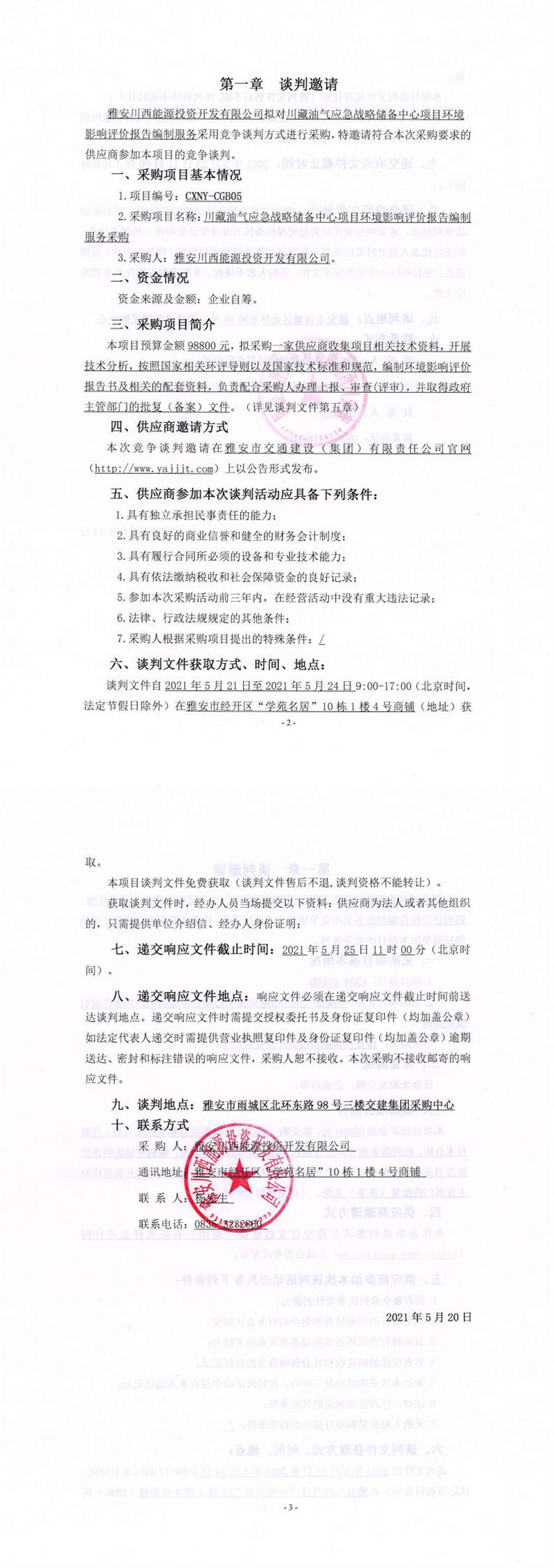 雅安川西能源投资开发有限公司川藏油气应急战略储备中心项目环境影响评价报告编制服务采购竞争谈判公告