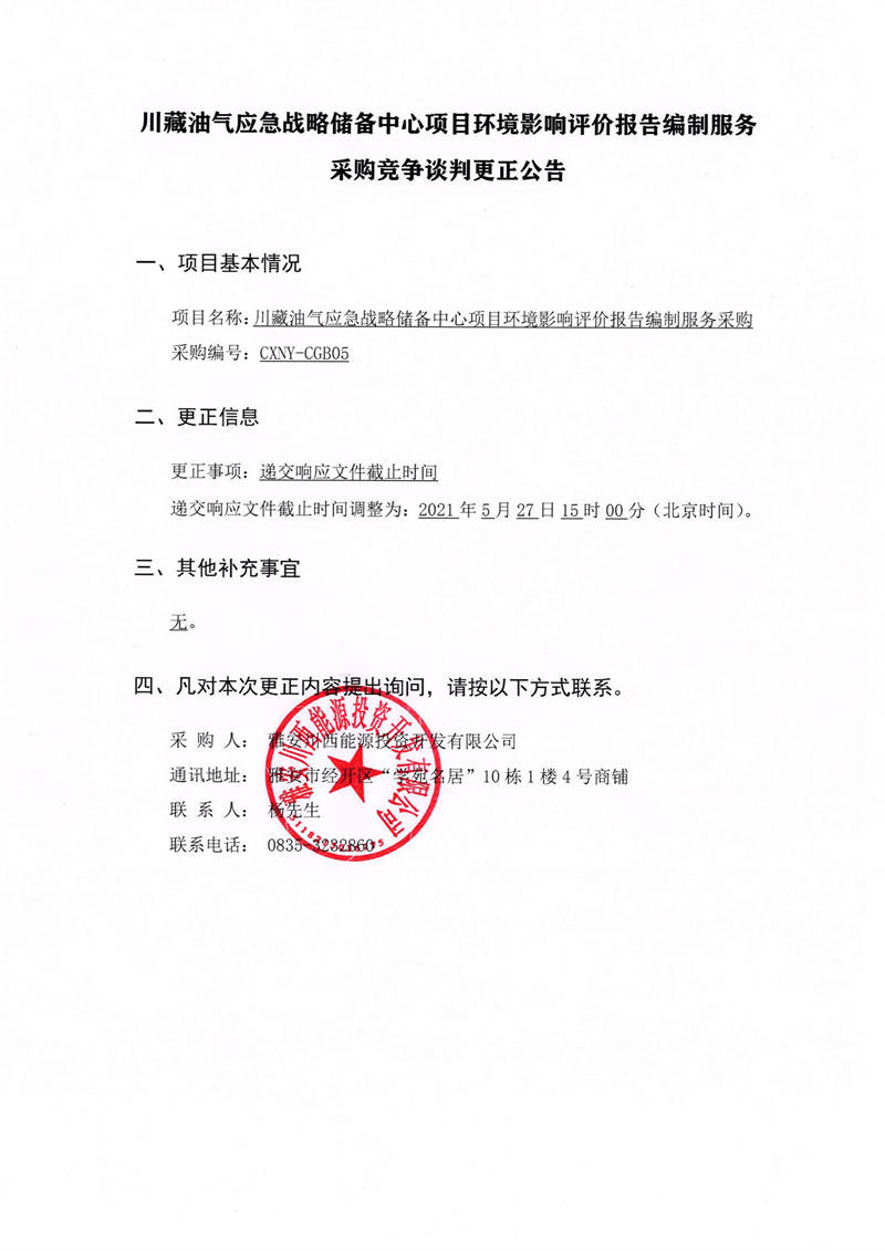 雅安川西能源投资开发有限公司川藏油气应急战略储备中心项目环境影响评价报告编制服务采购竞争谈判更正公告