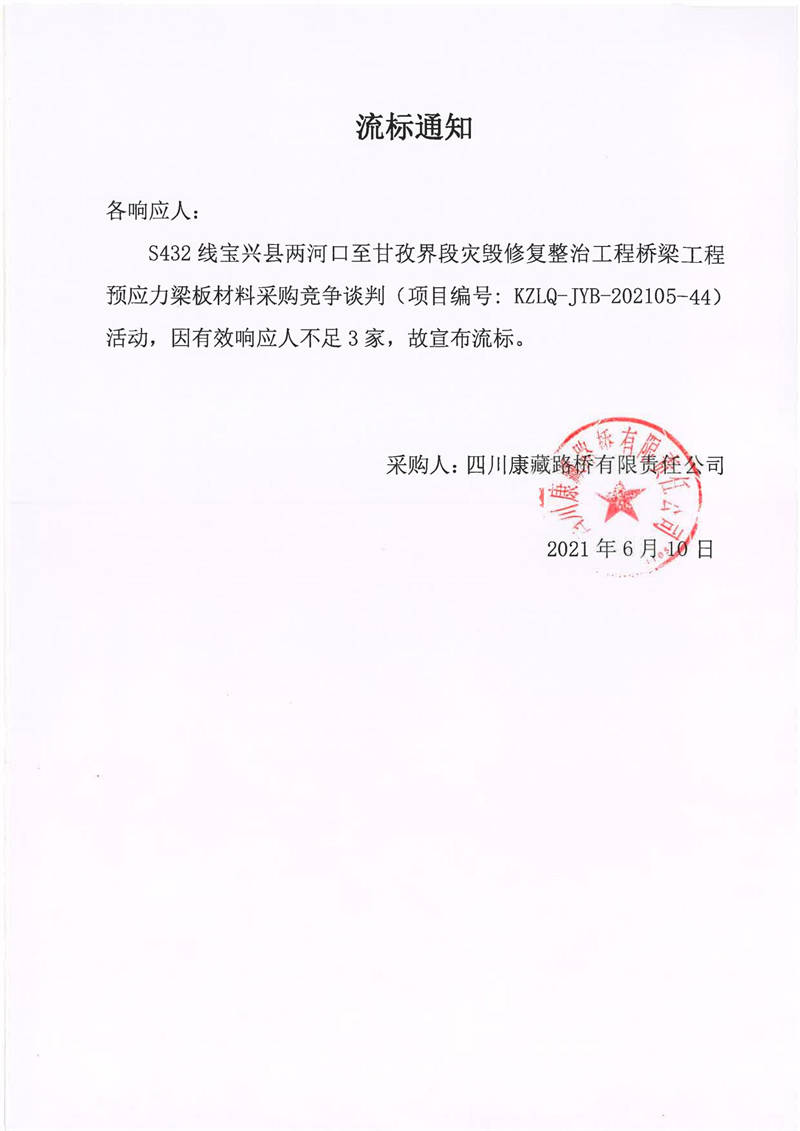 四川康藏路桥有限责任公司S432线宝兴县两河口至甘孜界段灾毁修复整治工程桥梁工程预应力梁板材料采购竞争谈判流标通知