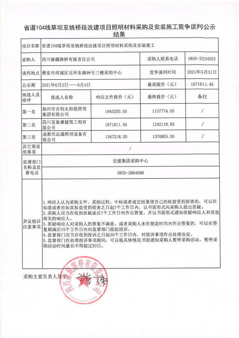 四川康藏路桥有限责任公司省道104线草坝至姚桥段改建项目照明材料采购及安装施工竞争谈判公示结果