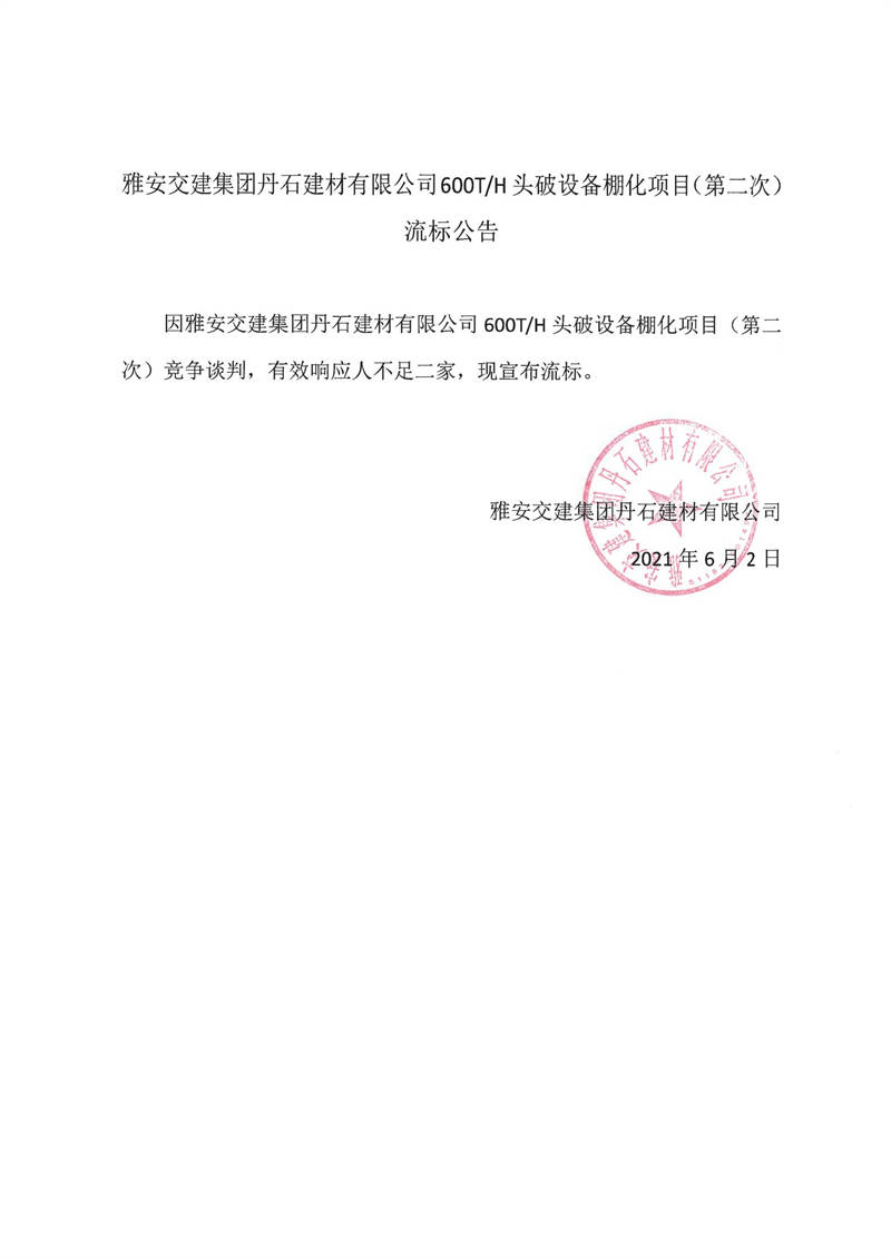 米兰体育-米兰(中国)官网 丹石建材有限公司600T/H头破设备棚化项目(第二次)流标公告