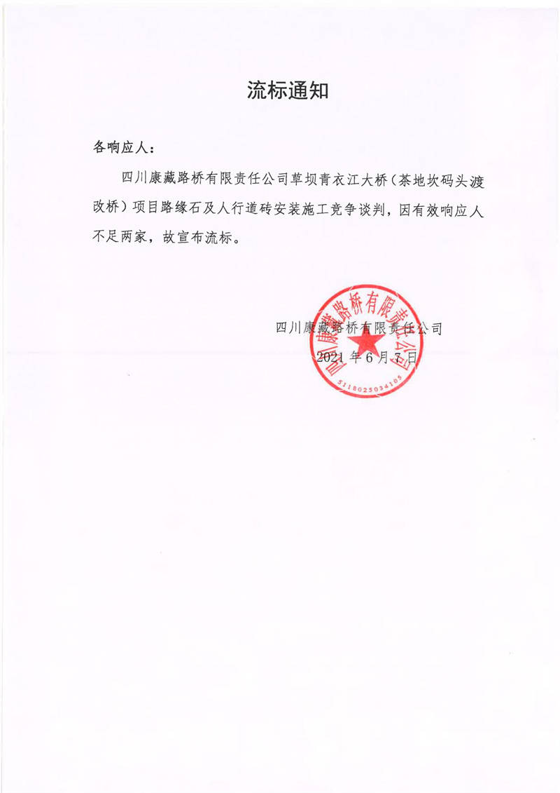 四川康藏路桥有限责任公司草坝青衣江大桥(茶地坎码头渡改桥)项目路缘石及人行道砖安装施工竞争谈判流标通知