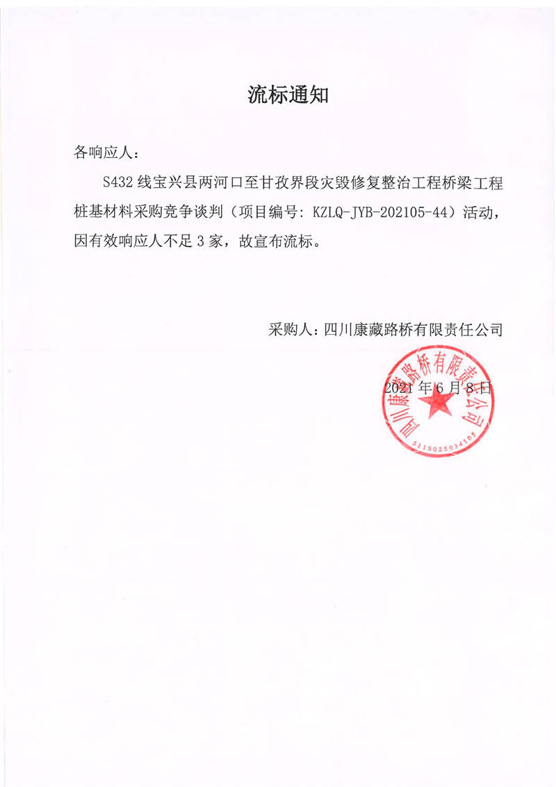 四川康藏路桥有限责任公司S432线宝兴县两河口至甘孜界段灾毁修复整治工程桥梁工程桩基材料采购竞争谈判流标通知