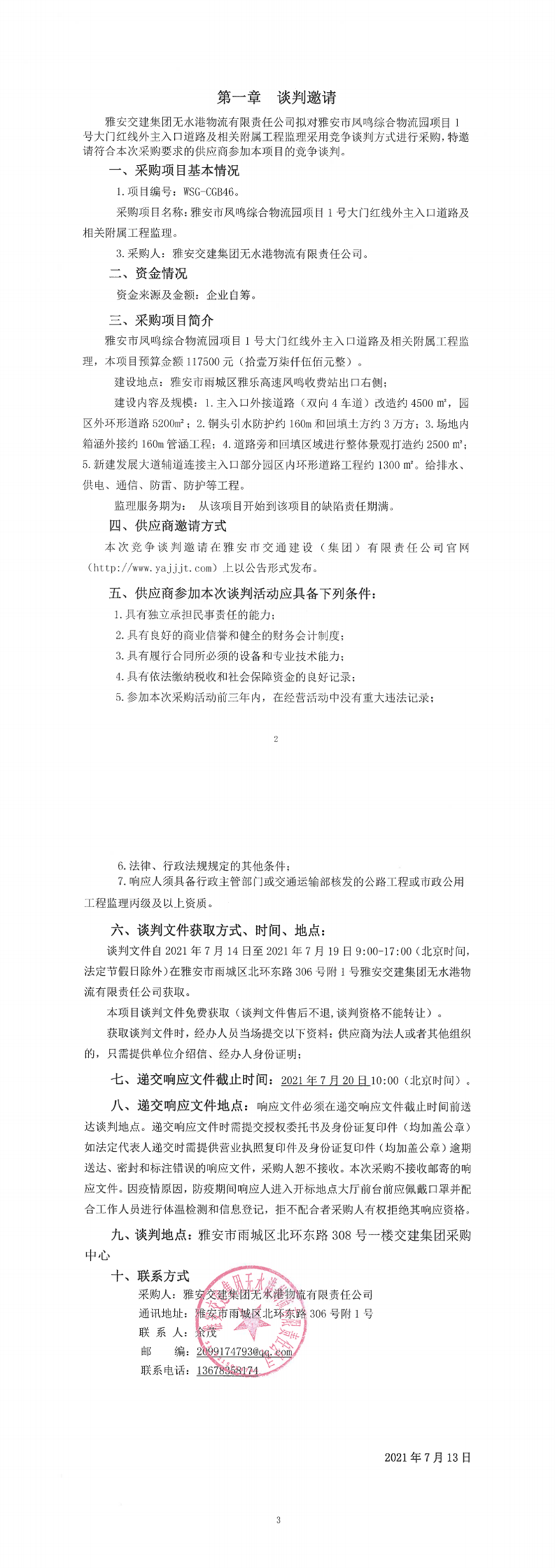 米兰体育-米兰(中国)官网 无水港物流有限责任公司雅安市凤鸣综合物流园项目1号大门红线外主入口道路及相关附属工程监理竞争谈判公告