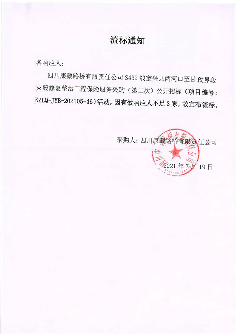四川康藏路桥有限责任公司S432线宝兴县两河口至甘孜界段灾毁修复整治工程保险服务采购(第二次)流标通知