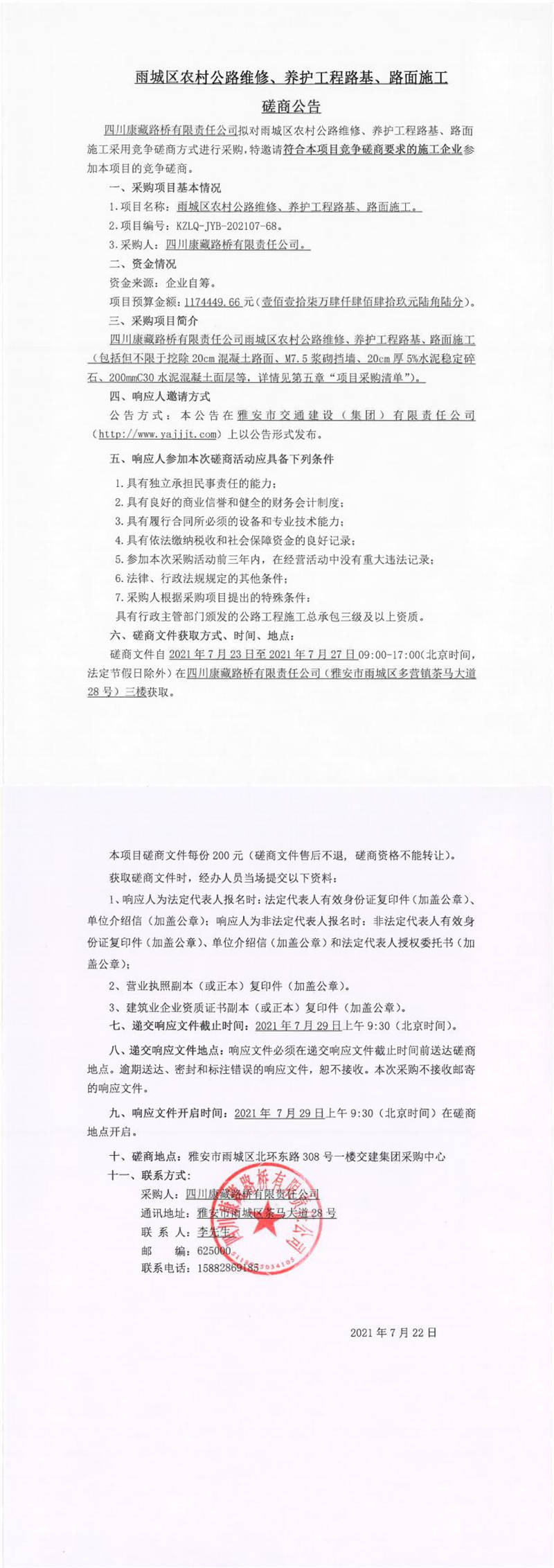 四川康藏路桥有限责任公司雨城区农村公路维修、养护工程路基、路面施工磋商公告