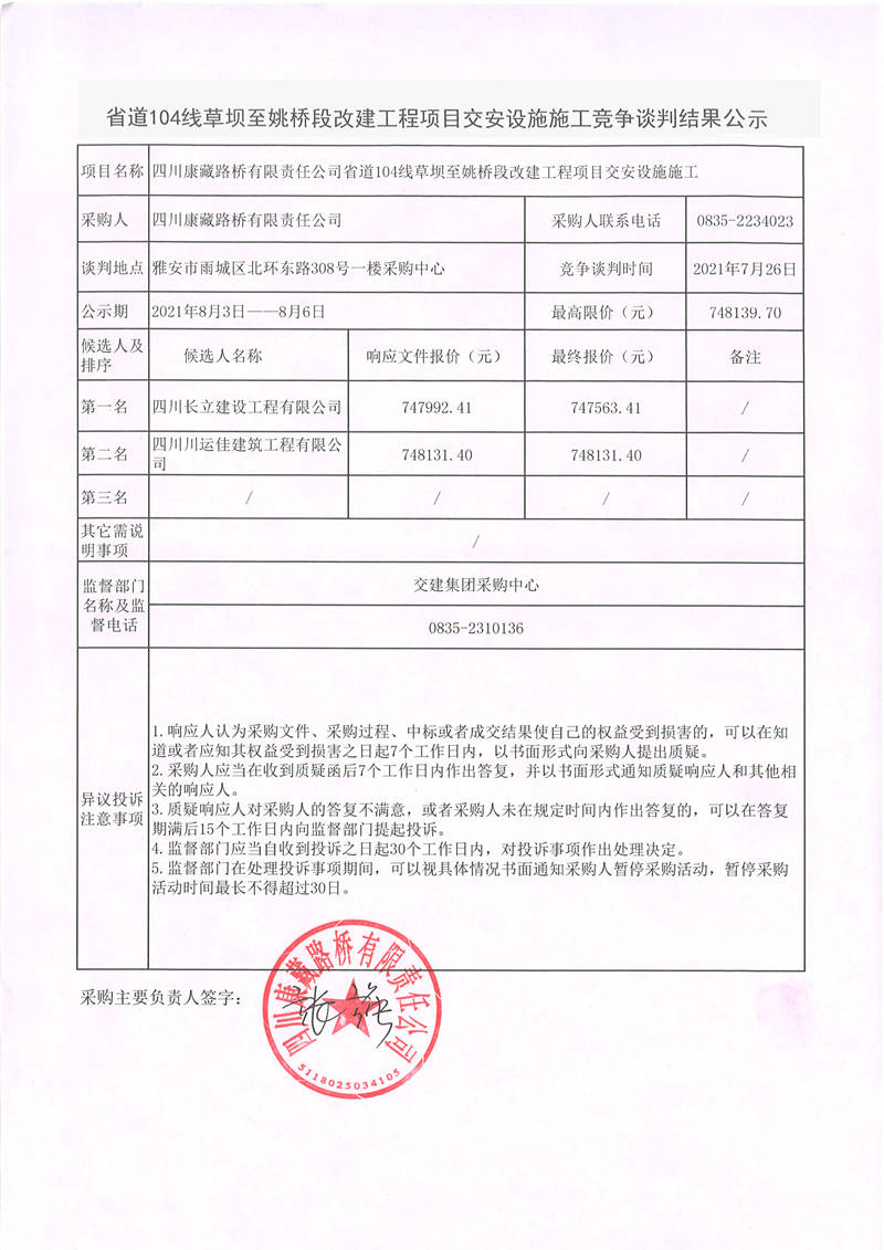 四川康藏路桥有限责任公司省道104线草坝至姚桥段改建工程项目交安设施施工竞争谈判结果公示