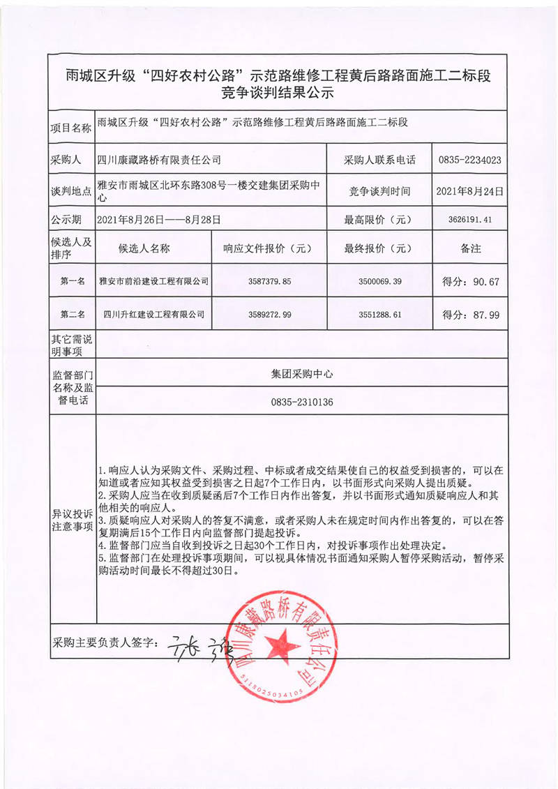 四川康藏路桥有限责任公司雨城区升级“四好农材公路”示范路维修工程黄后路路面施工二标段竞争谈判结果公示