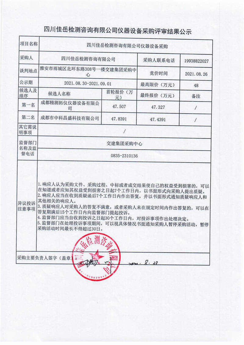四川佳岳检测咨询有限公司仪器设备采购评审结果公示