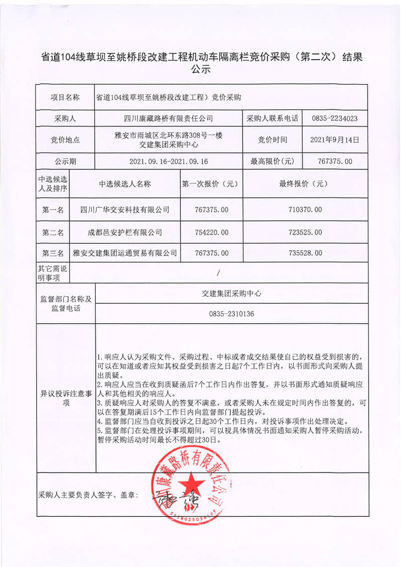 四川康藏路桥有限责任公司省道104线草坝至姚桥段改建工程机动车隔离栏竞价采购(第二次)结果公示