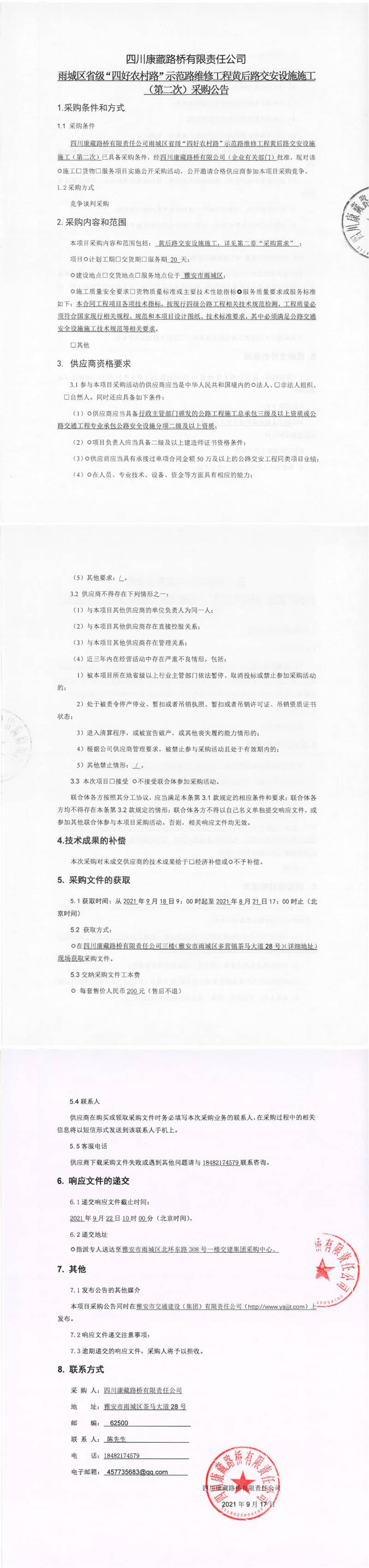 四川康藏路桥有限责任公司雨城区省级“四好农村路”示范路维修工程黄后路交安设施施工(第二次)采购公告