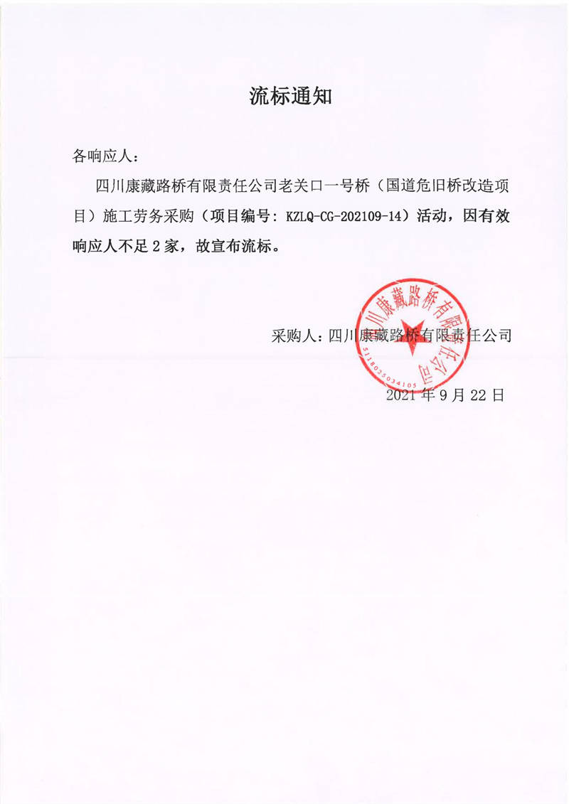四川康藏路桥有限责任公司老关口一号桥(国道危旧桥改造项目)施工劳务采购流标通知