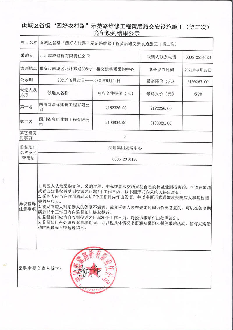 四川康藏路桥有限责任公司雨城区省级“四好农村路”示范路维修工程黄后路交安设施施工(第二次)竞争谈判结果公示