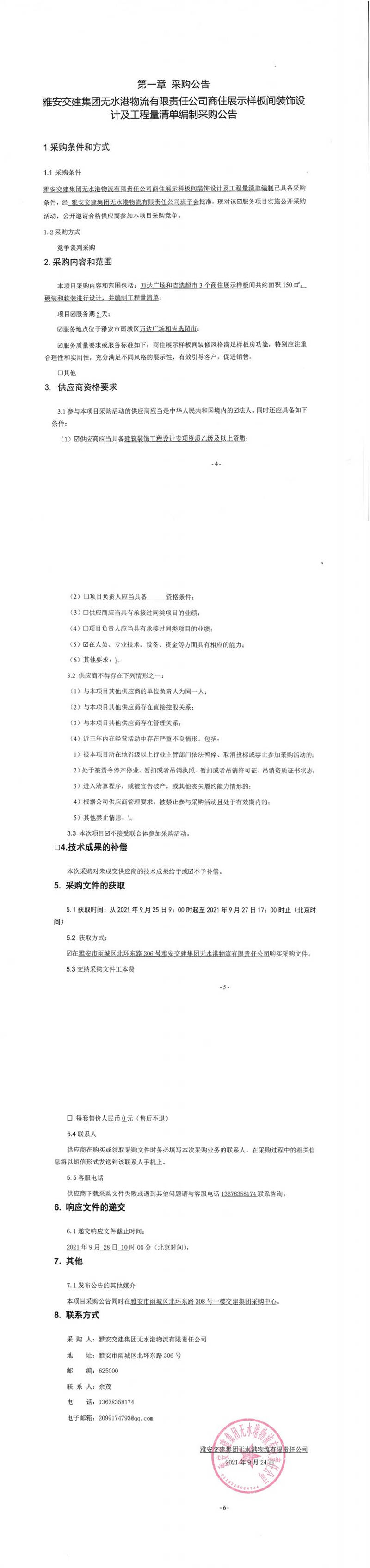 米兰体育-米兰(中国)官网 无水港物流有限责任公司雅安市凤鸣综合物流园项目售楼部装饰装修工程(第二次)采购公告