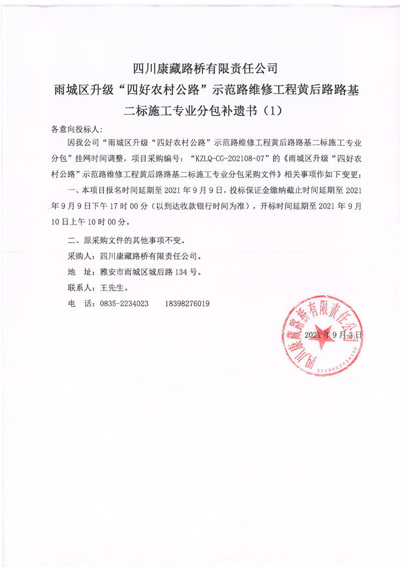 四川康藏路桥有限责任公司雨城区升级“四好农材公路”示范路维修工程黄后路路基二标施工专业分包补遗书(1)