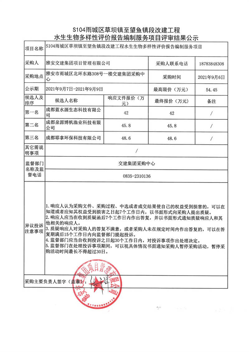 米兰体育-米兰(中国)官网 项目管理有限公司S104雨城区草坝镇至望鱼镇段改建工程水生生物多样性评价报告编制服务项目评审结果公示