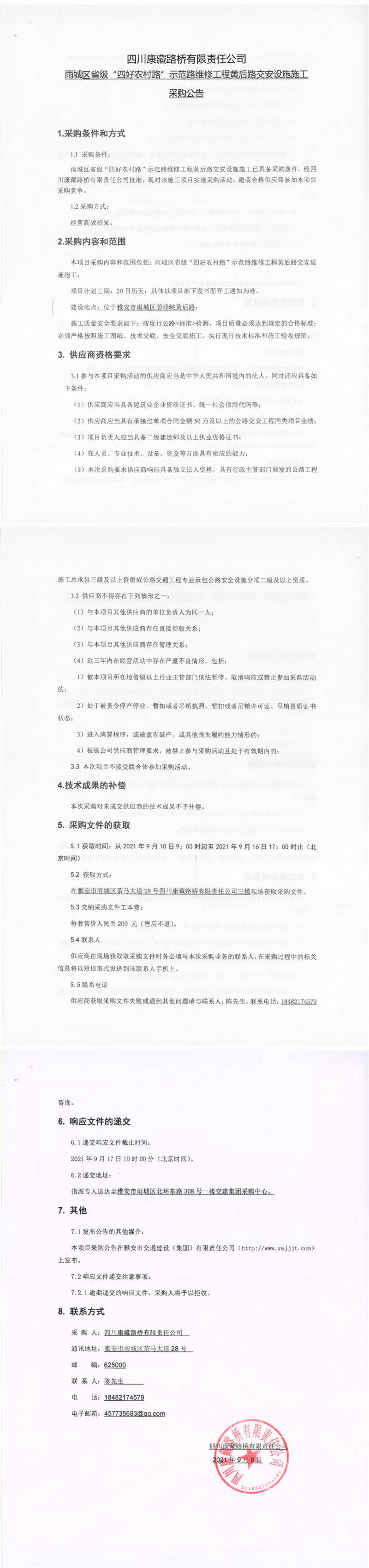 四川康藏路桥有限责任公司雨城区省级“四好农村路”示范路维修工程黄后路交安设施施工采购公告
