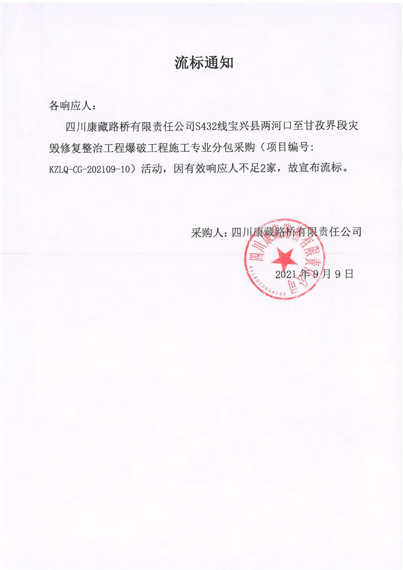 四川康藏路桥有限责任公司S432线宝兴县两河口至甘孜界段灾毁修复整治工程爆破工程施工专业分包采购流标通知