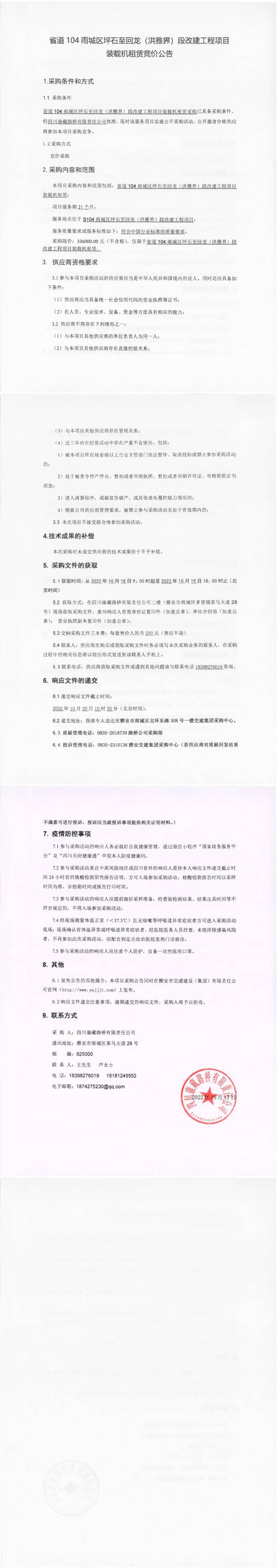 四川康藏路桥有限责任公司省道104雨城区坪石至回龙(洪雅界)段改建工程项目装载机租赁竞价公告