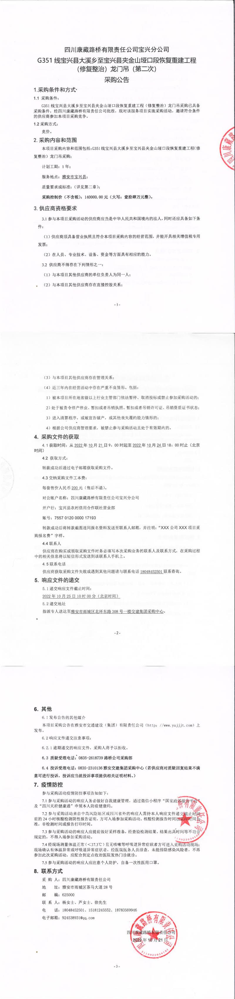 四川康藏路桥有限责任公司宝兴分公司G351线宝兴县大溪乡至宝兴县夹金山垭口段恢复重建工程(修复整治)龙门吊(第二次)采购公告