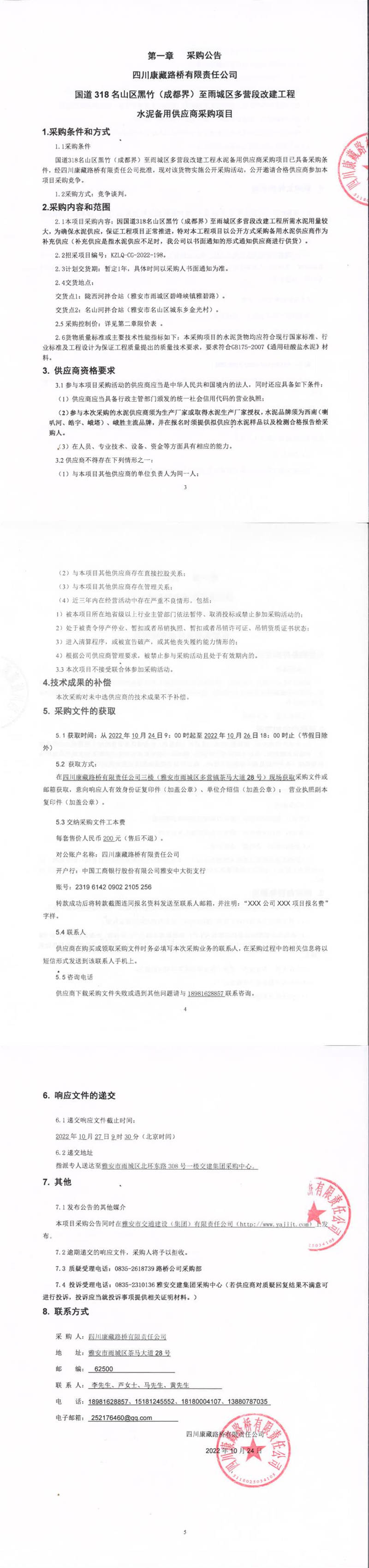 四川康藏路桥有限责任公司国道318名山区黑竹(成都界)至雨城区多营段改建工程水泥备用供应商采购项目补遗书(一)
