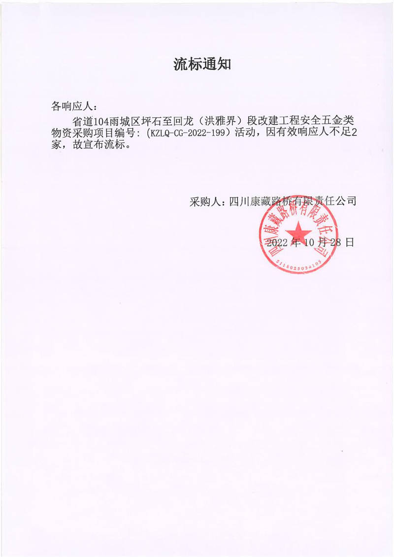 四川康藏路桥有限责任公司省道104雨城区坪石至回龙(洪雅界)段改建工程安全五金类物资采购项目流标通知