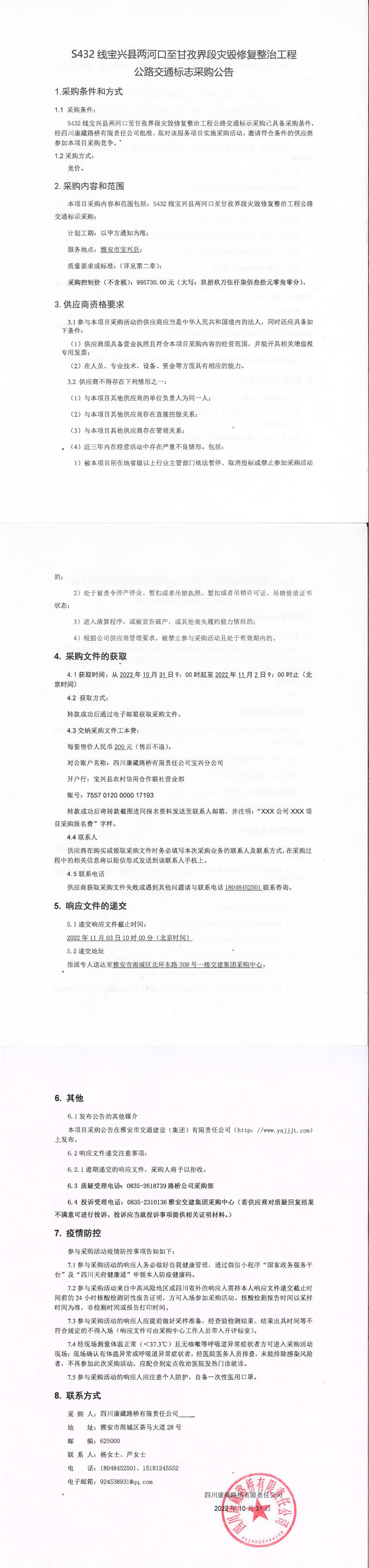 四川康藏路桥有限责任公司S432线宝兴县两河口至甘孜界段灾毁修复整治工程公路交通标志采购公告