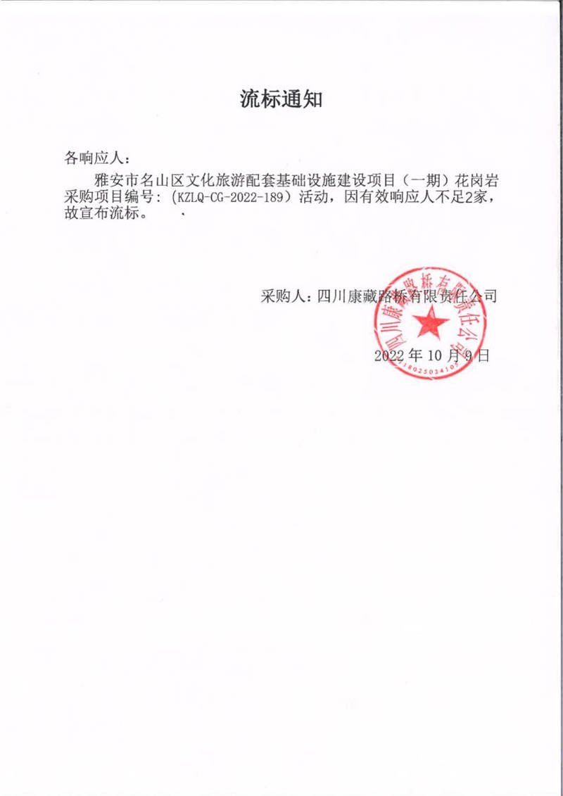 四川康藏路桥有限责任公司雅安市名山区文化旅游配套基础设施建设项目(一期)花岗岩采购项目流标通知