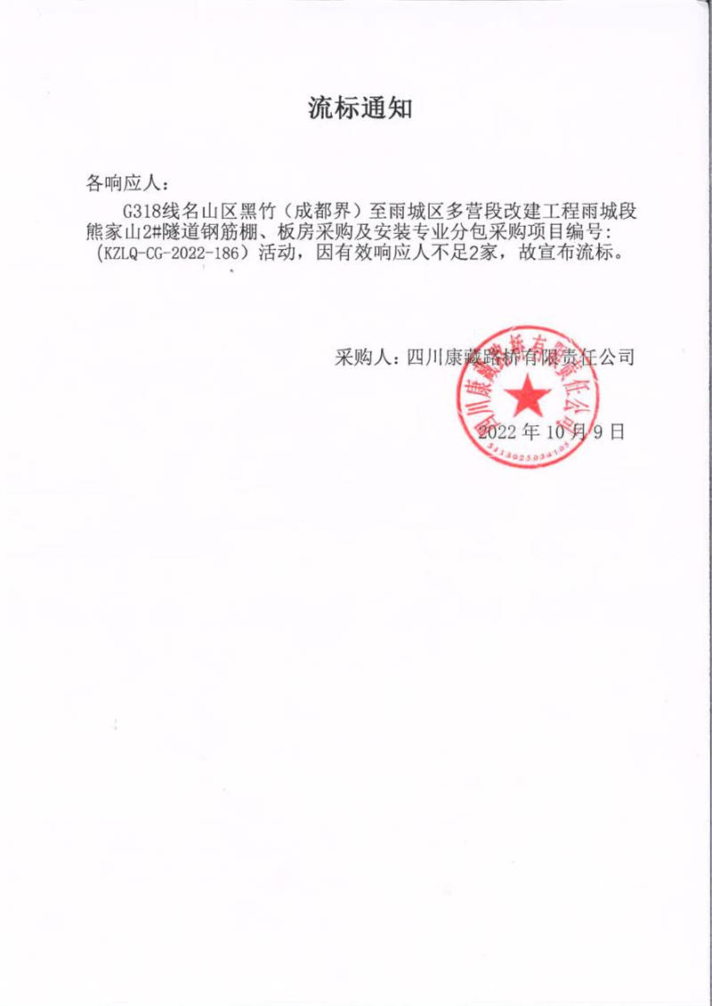 四川康藏路桥有限责任公司G318线名山区黑竹(成都界)至雨城区多营段改建工程雨城段熊家山2#隧道钢筋棚、板房采购及安装专业分包采购项目流标通知