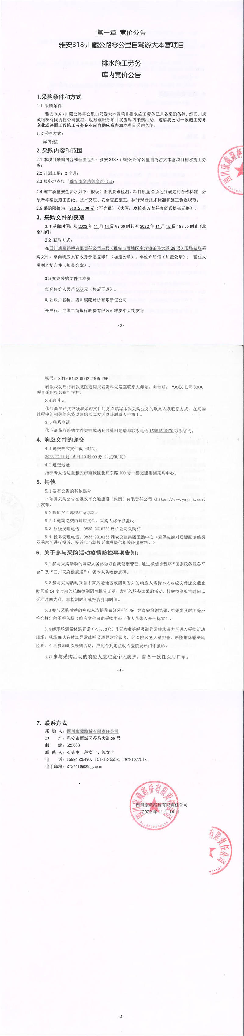 四川康藏路桥有限责任公司雅安318.川藏公路零公里自驾游大本营项目排水施工劳务库内竞价公告
