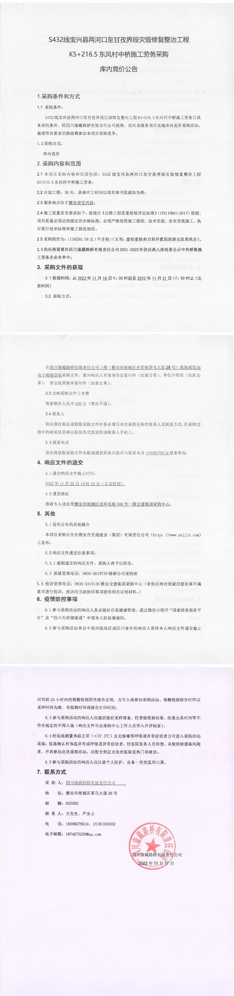 四川康藏路桥有限责任公司S432线宝兴县两河口至甘孜界段灾毁修复整治工程K5+216.5东风村中桥施工劳务采购库内竞价公告