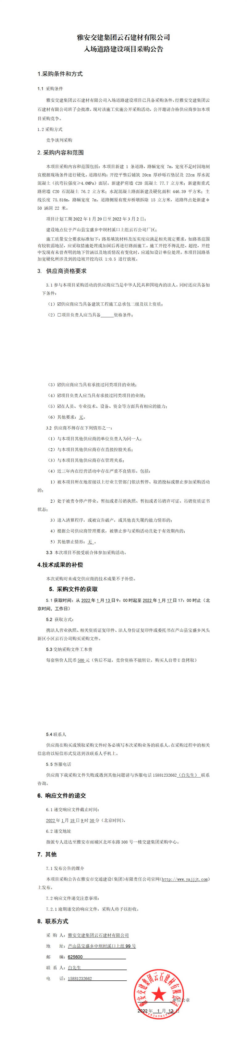 米兰体育-米兰(中国)官网 云石建材有限公司入场道路建设项目采购公告