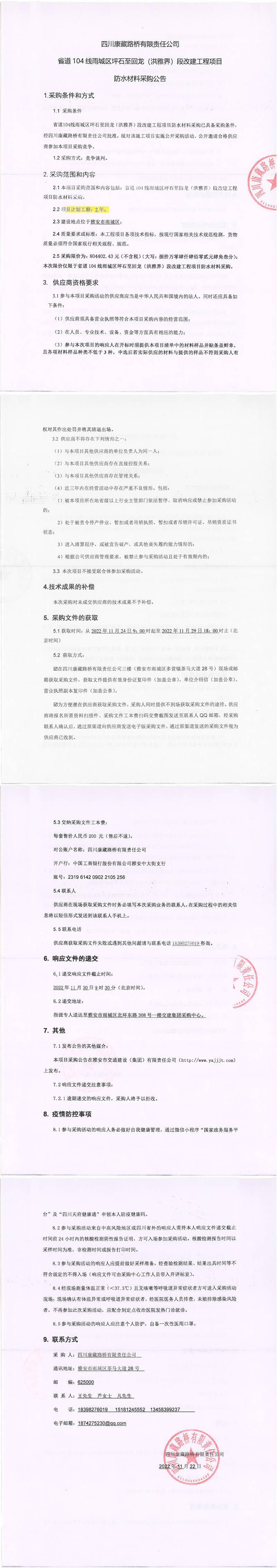 四川康藏路桥有限责任公司省道104雨城区坪石至回龙(洪雅界)段改建工程项目防水材料采购公告