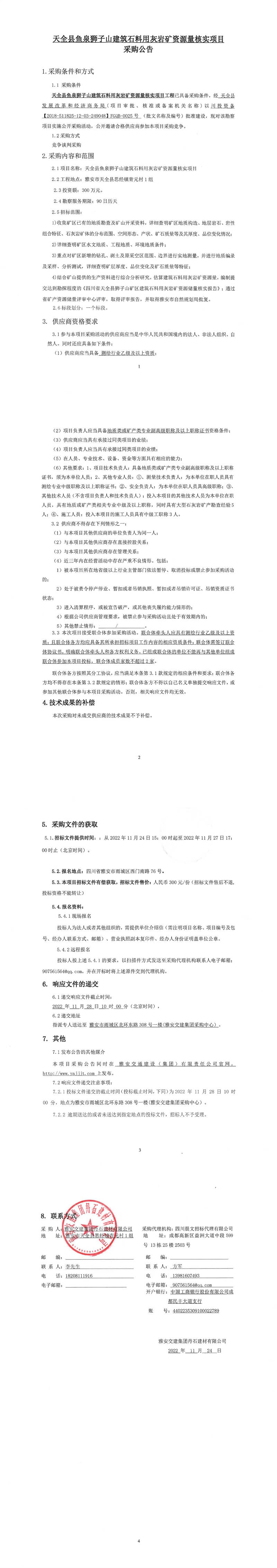 米兰体育-米兰(中国)官网 丹石建材有限公司天全县鱼泉狮子山建筑石料用灰岩矿资源量核实项目采购公告