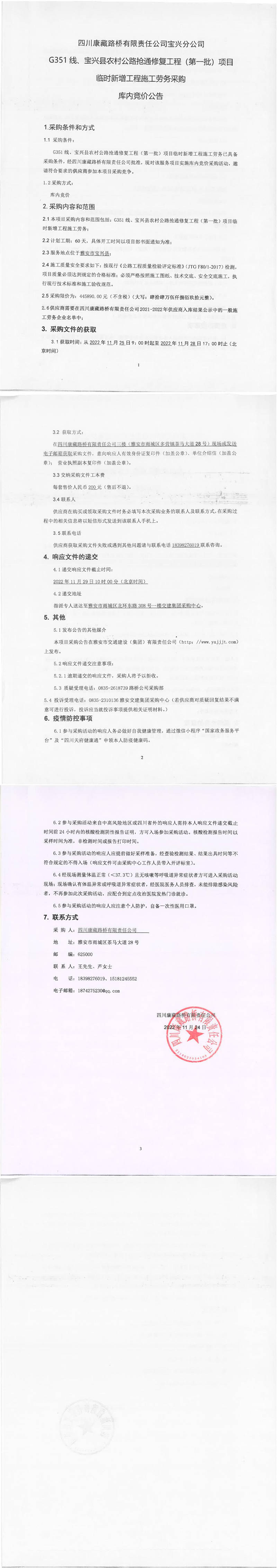 四川康藏路桥有限责任公司G351线、宝兴县农村公路抢通修复工程(第一批)项目临时新增工程施工劳务采购库内竞价公告