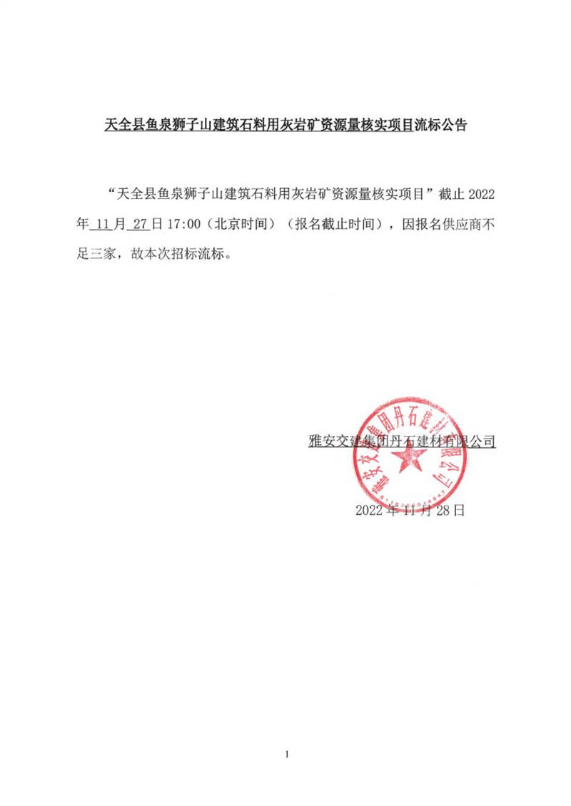 米兰体育-米兰(中国)官网 丹石建材有限公司天全县鱼泉狮子山建筑石料用灰岩矿资源量核实项目流标公告