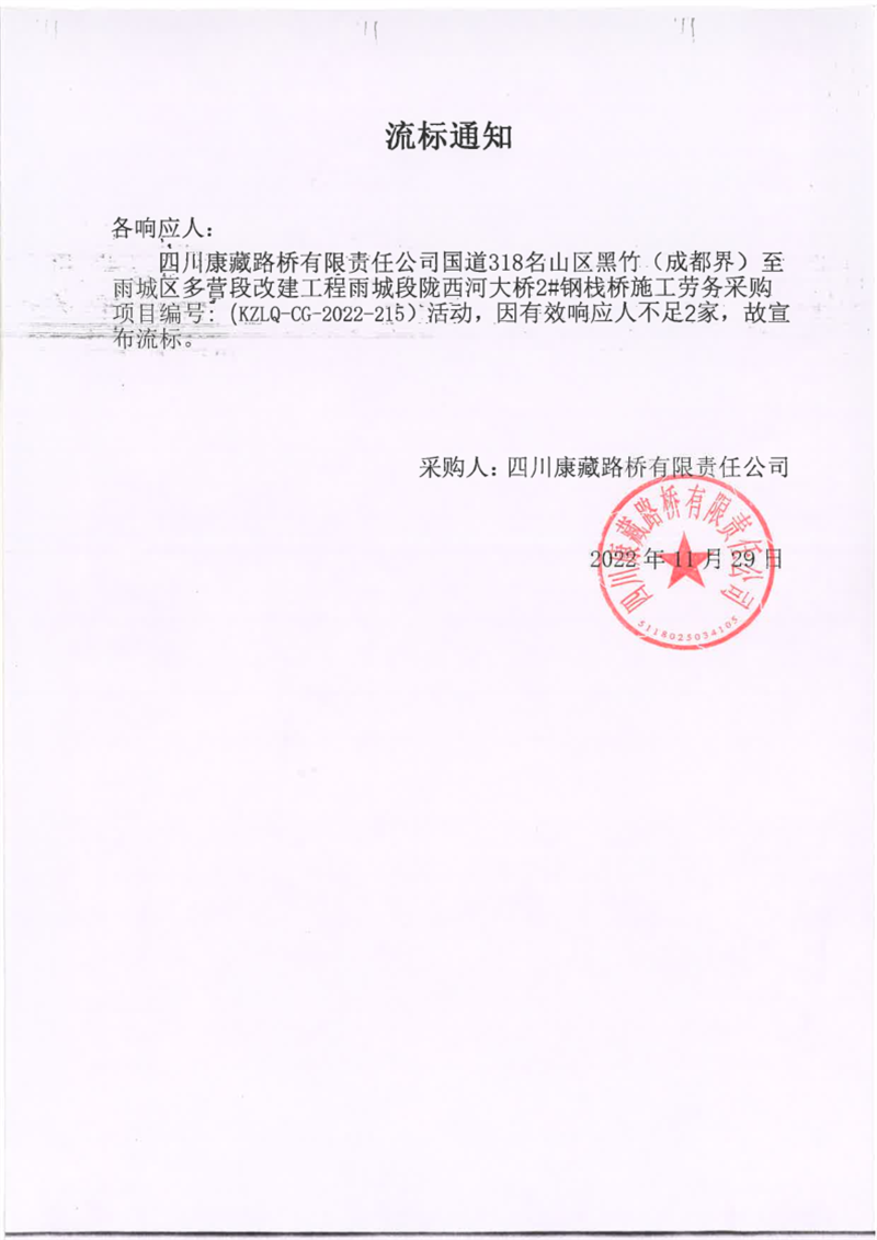 四川康藏路桥有限责任公司国道318名山区黑竹(成都界)至雨城区多营段改建工程雨城段陇西河大桥2#钢栈桥施工劳务采购流标通知