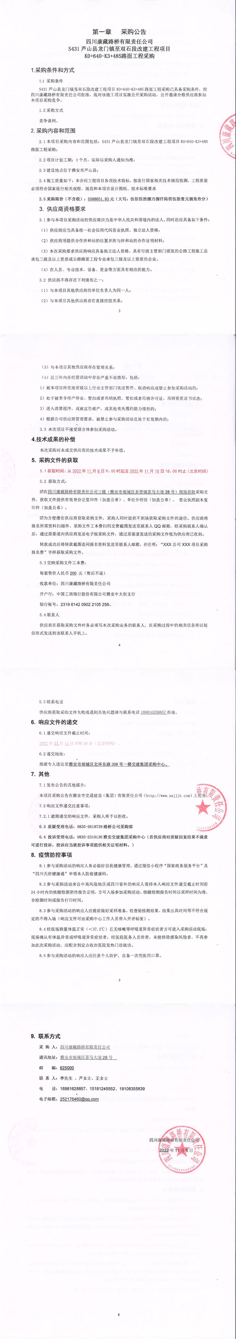 四川康藏路桥有限责任公司S431芦山县龙门镇至双石段改建工程项目K0+640-K3+485路面工程采购公告