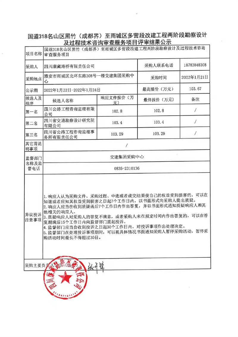 四川康藏路桥有限责任公司国道318名山区黑竹(成都界)至雨城区多营段改建工程两阶段勘察设计及过程技术咨询审查服务项目评审结果公示